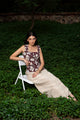 Designed to sculpt and celebrate the female form, the bodice features a structured square neckline and a corsetstyle lace-up back that allows you to dictate the silhouette— wear it relaxed for the day or cinched tight for an hourglass evening look. Each petal on the print is not merely printed but immortalized with hand-applied seed beads in copper and garnet tones, catching the candlelight with a subtle, liquid glimmer.
