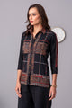 This black button-up shirt Signature Elements the patching up of prints with ajrakh patterns .