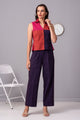 The no-sleeve cotton slub top has been color blocked with patches of rich hued fabrics .